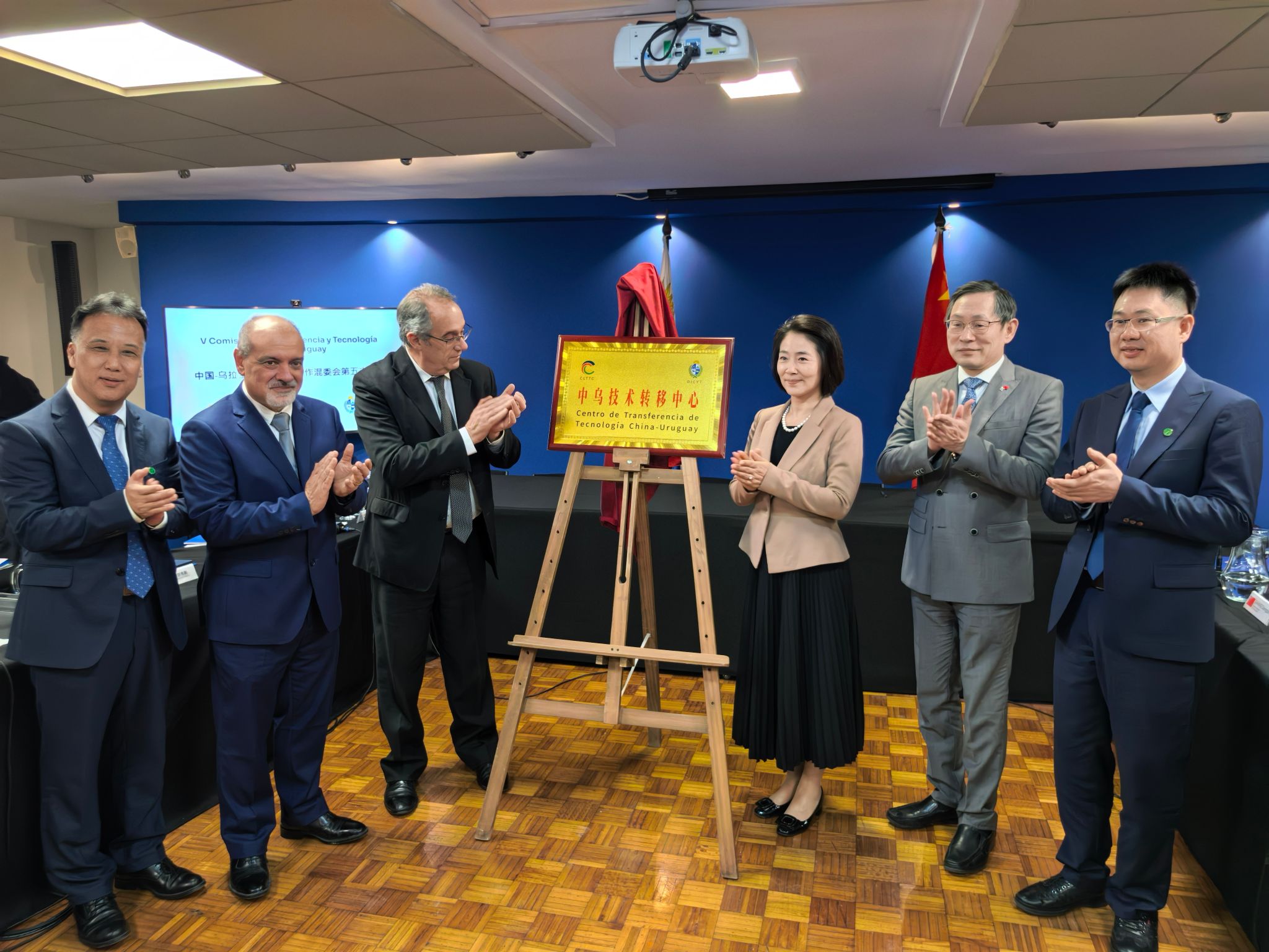 出访团组还参加了中国—乌拉圭技术转移中心(以下简称“中乌技术转移中心”)启动仪式。中国科技部副部长林新,乌拉圭教育文化部部长何塞·卡洛斯·马伊亚(José Carlos Mahía),中国驻乌拉圭大使黄亚中,乌拉圭教育文化部创新科技司司长贡萨洛·坦克雷迪(Gonzalo Tancredi),学校校长马宏伟,中拉技术转移中心执行主任陈佰满等中乌双方代表共同出席揭牌仪式。